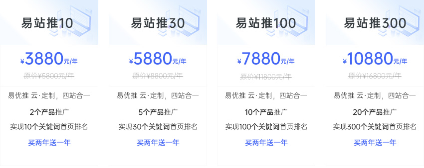 答:易站推采用的是推广定额费用,而且不是点击付费,按上词10个的套餐3880元的费用算,最少保证有10个关键词出现在各大搜索引擎首页,并直达官网,如果扣除建站的费用,基本上没有任何推广成本,并且每个关键词每年的费用不足100元。易优推为客户提供买两年送一年,买三年送两年的优惠套餐,这样单个关键词的推广费用更为低廉。如果开通300个词的价格就已经达到了每年几十块钱,所以针对于搜索引擎竞价排名和传统SEO只能做少量词而且费用昂贵来说,易站推服务性价比要更高。