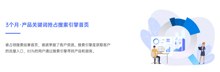 可推广10个产品,100个相关关键词排在搜索引擎首页并直达官网。